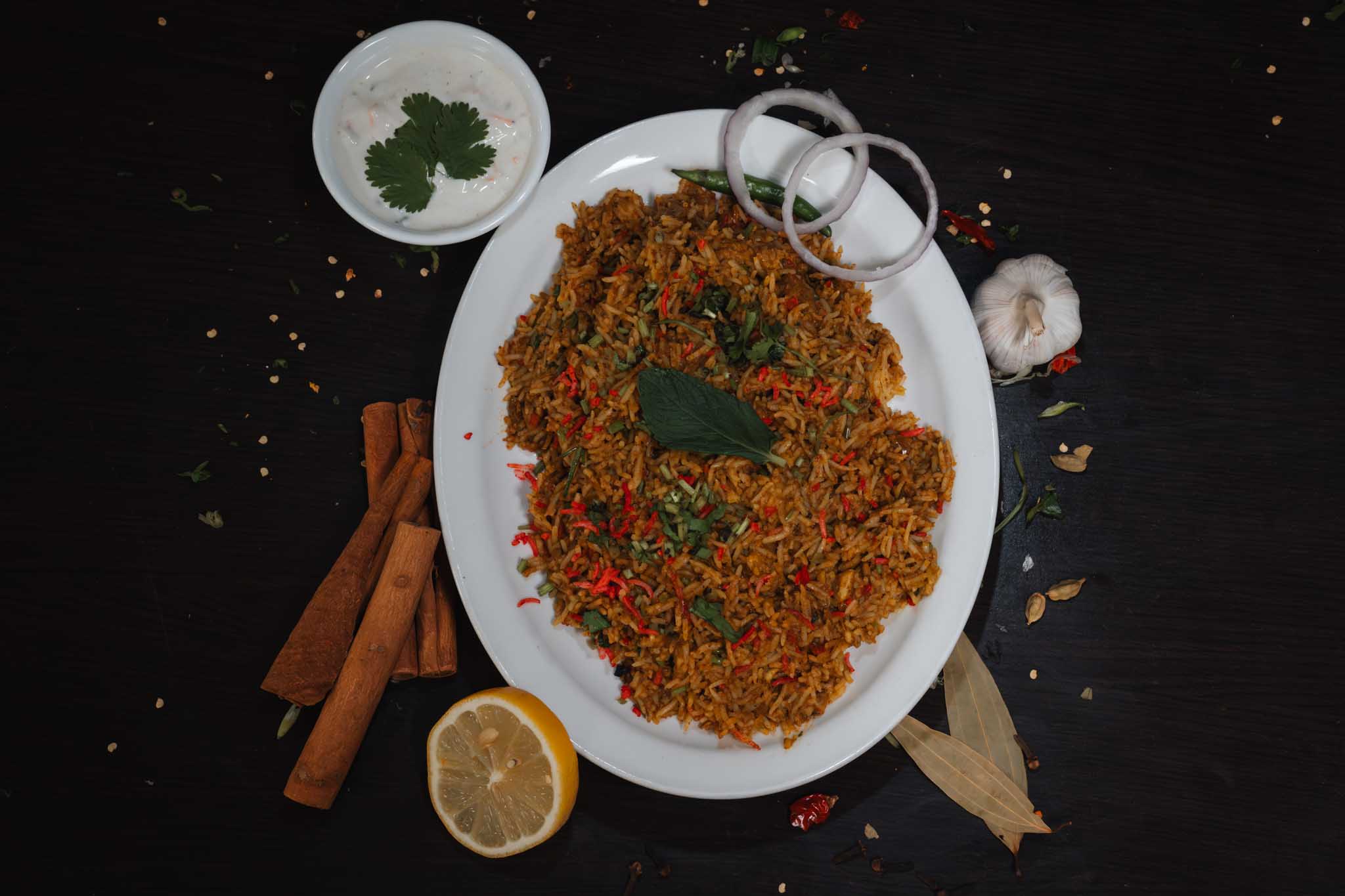 Basmati rice cooked in special biryani masala. Served with vegetables, spices, with a side of raita.